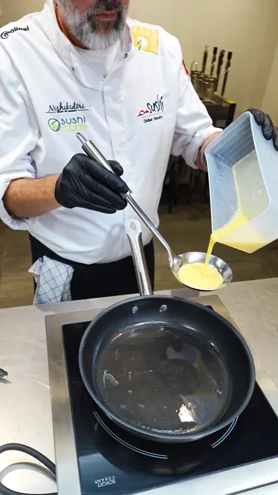 - Préparation des protéines : tamagoyaki (omelette roulée) & karaage (poulet frit)